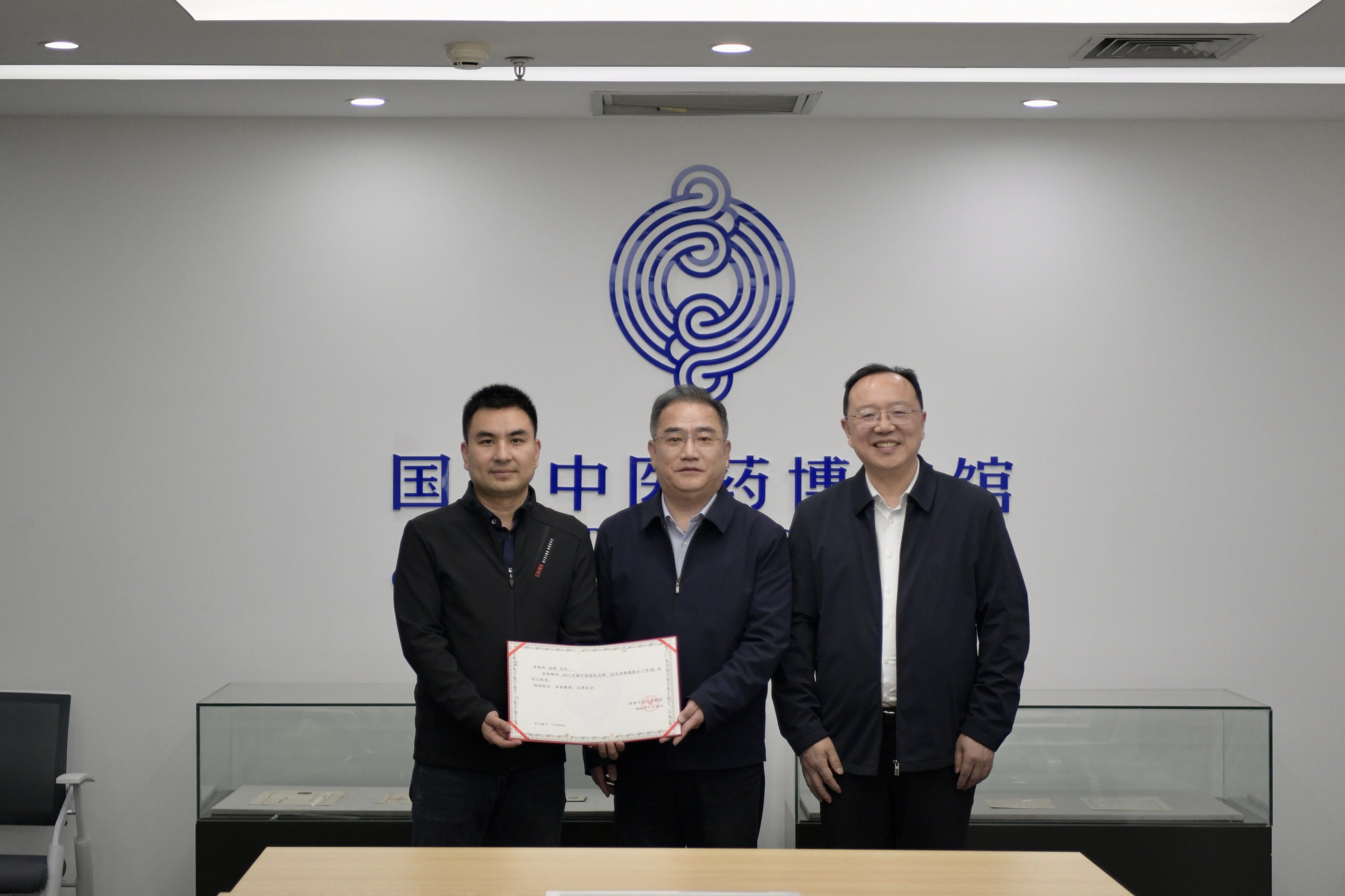 杨荣臣向钟峰颁发捐赠证书,并对其支持国家中医药博物馆事业发展的情怀表示感谢。他指出此次捐赠的纪念章及相关见证物,充实了中医药博物馆公共卫生事件防控领域的馆藏。中医药博物馆将妥善保管、科学陈列这批珍贵实物。